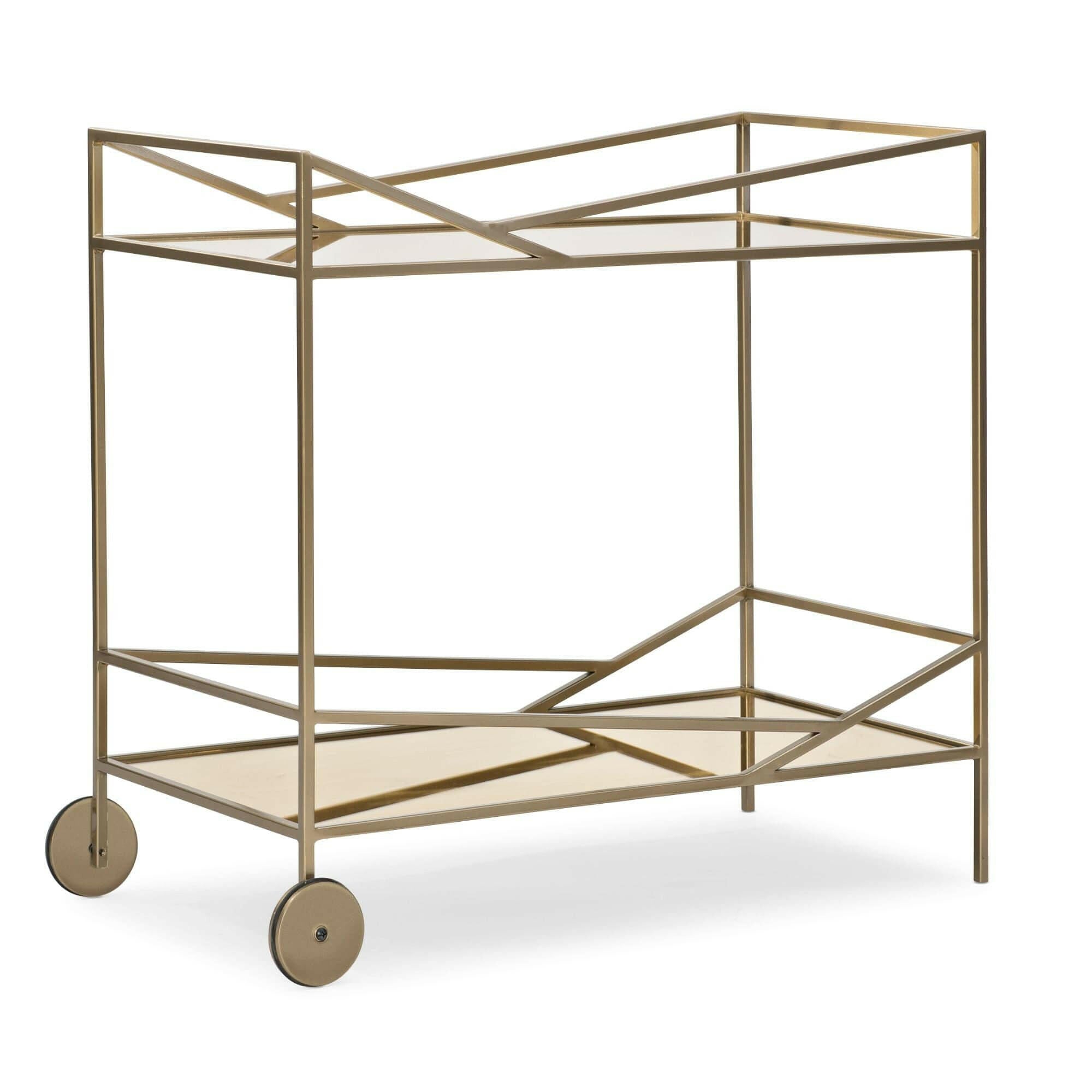 Introducing the Vector Bar Cart - the ultimate addition to your home for hosting and entertaining. This stunning piece features an open framework of architectural-inspired metal, giving it a modern and unique character. The warm Lucent Bronze finish ensures it will effortlessly complement any décor. With two bronze mirrored shelves, this bar cart offers both storage and display space. But what sets it apart is its functionality - working wheels allow you to easily move the party to any room in your home. With its compact size and sophisticated style, this multifunctional piece is a must-have for any home. Crafted with a metal frame and finished in Lucent Bronze Smooth Metallic Paint, this bar cart is both durable and stylish. Dimensions: 91.4 x 43.2 x 80.6. Shop now at House of Isabella for luxurious furniture and interiors, with free UK delivery.