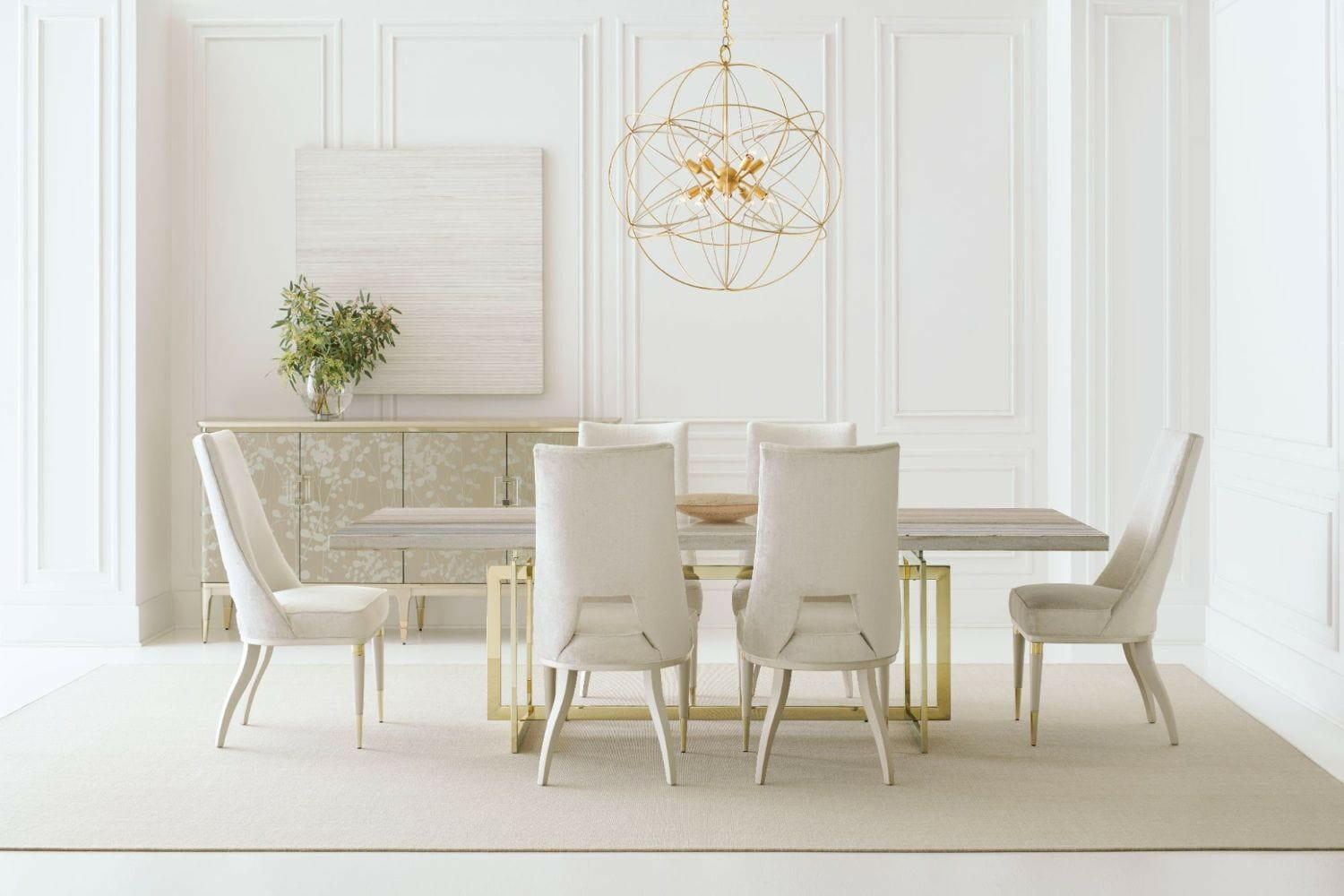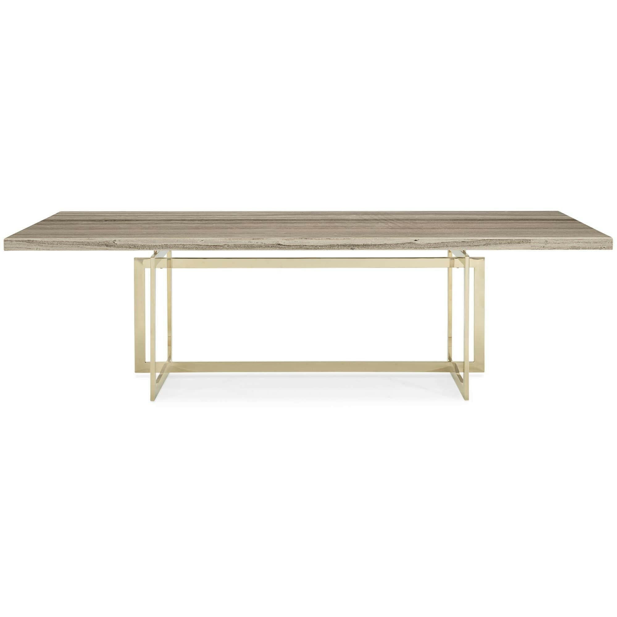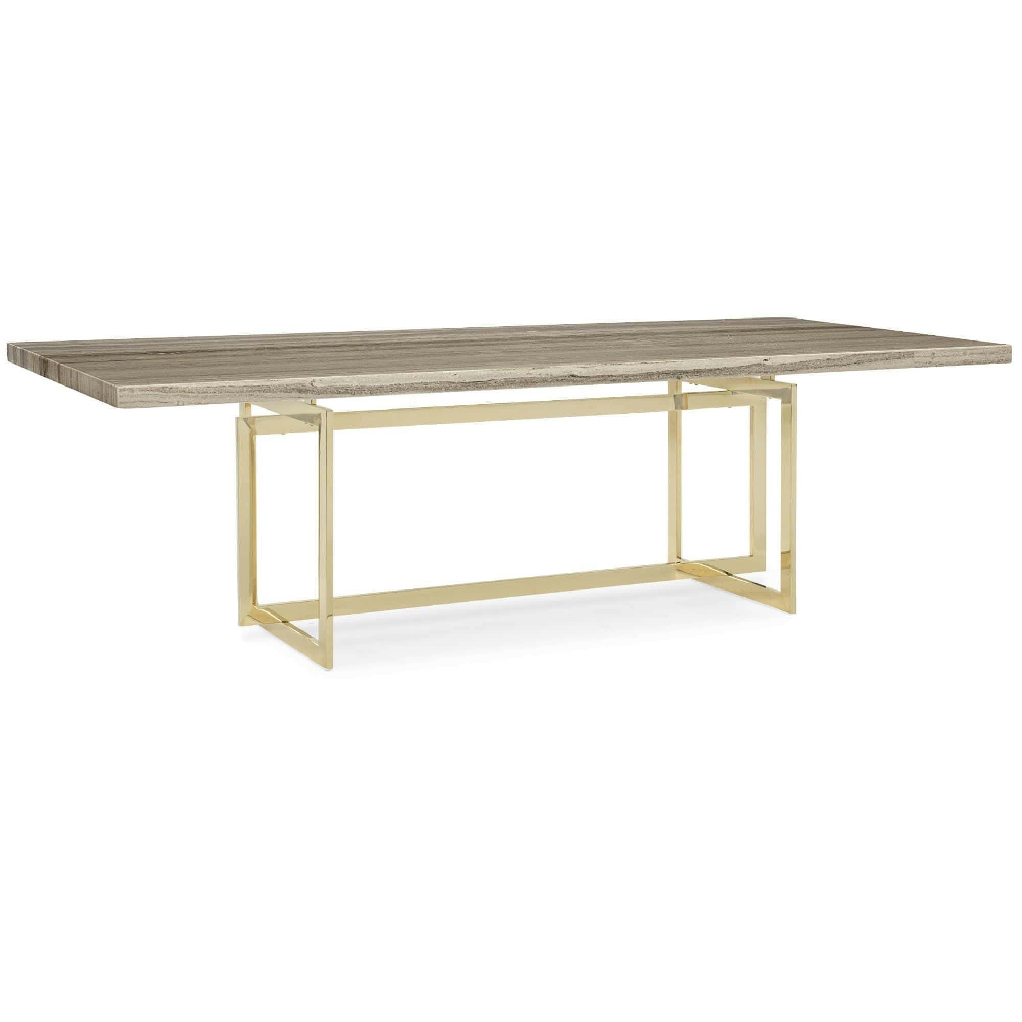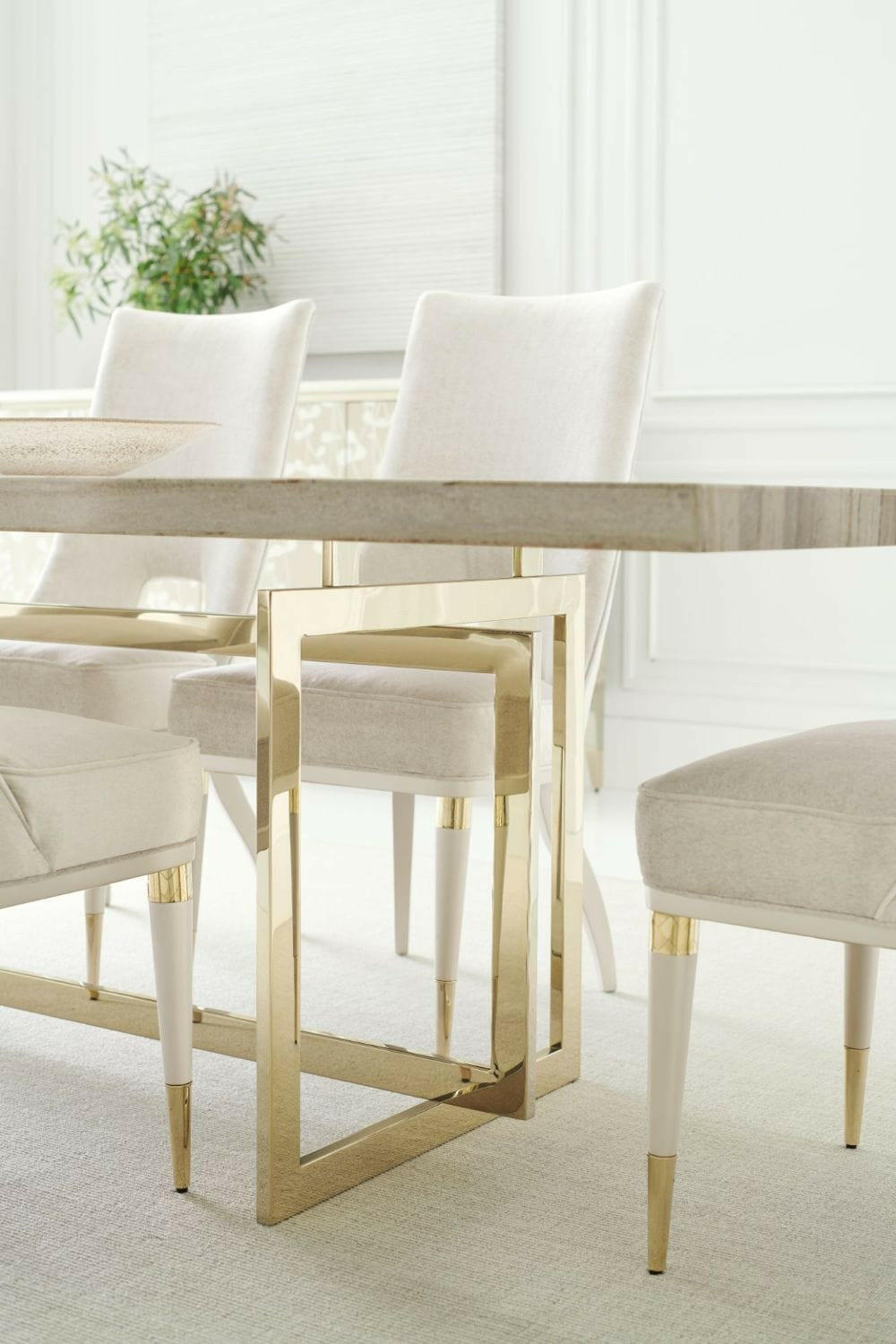 Because not all dining rooms are created equal, there’s the Wish You Were Here table. An extraordinary example of organic luxe, it offers an ultra-impressive 100-inch tabletop of grey sandstone. Earthy tones meld with greiges and soft greys to create a visual that’s sleek and modern while still feeling warm and natural. A bold, open geometric base finished in Whisper of Gold creates a mix of materials and brings in the glamour. With a dining room table this stunning, you’ll hesitate to cover it! Metal base finished in Whisper of Gold. Gray Sandstone top.