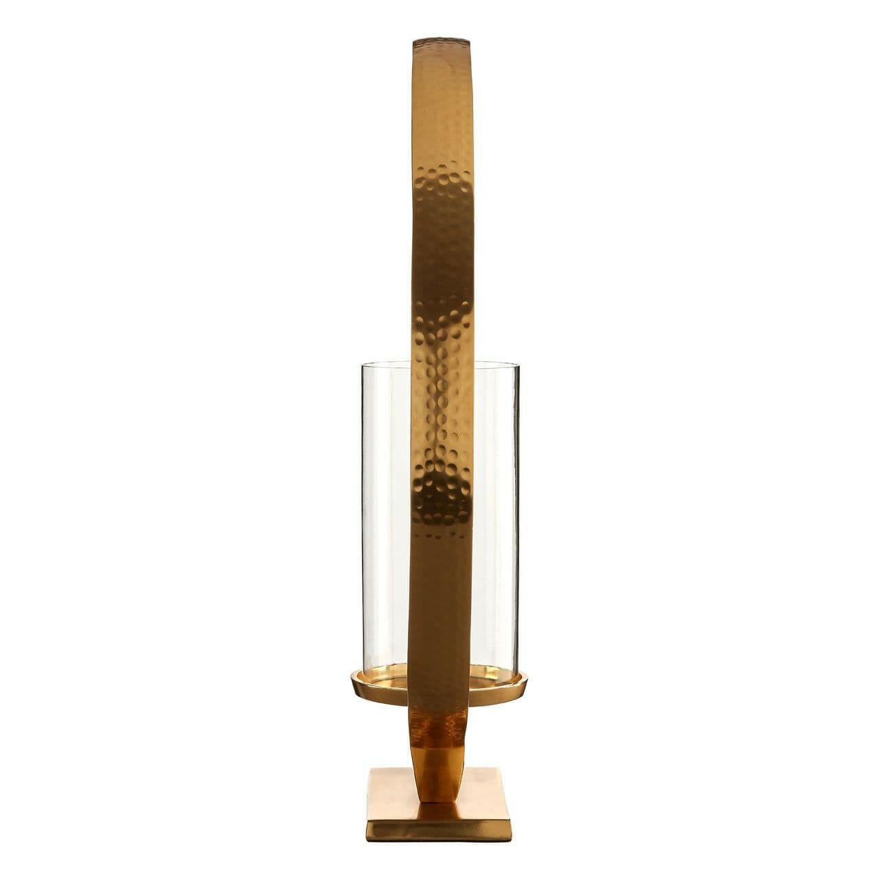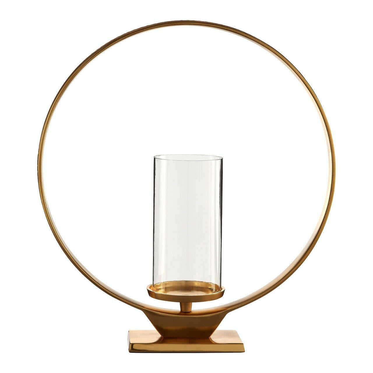 The large Cirqua candle holder features an O-shaped design, framing the central glass lantern, with a rectangular pedestal raising the holder. A stylish gold finish lends the candle holder luxe appeal.