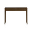 One drawer brown console table in brown stained solid oak and oak veneer, curved front, curved legs, cut lines, visible grain, metal runners on drawers and bronze style bar