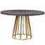 Round dining table with grey faux dark concrete top, concrete texture, antique brass colour base, requires assembly