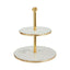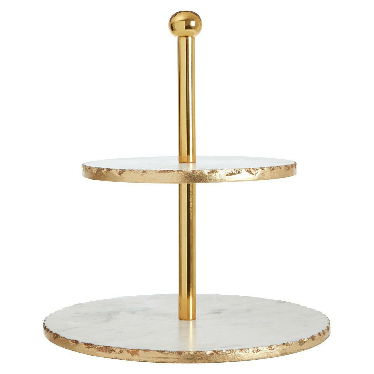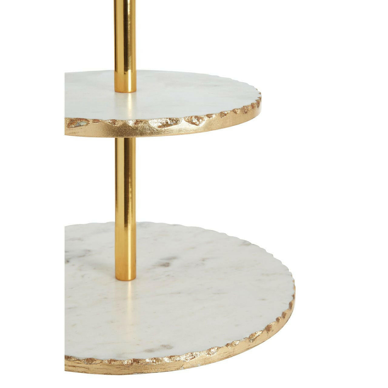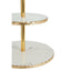 This cake stand has two different sized marble shelves which have gold foiling around the edges that contrasts its natural surface. These round tiers are held vertically by a gold finish metallic rod which provides a firm hold while carrying. Elegantly designed, it will add a warm metallic accent to the dinner table.
