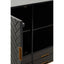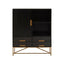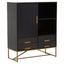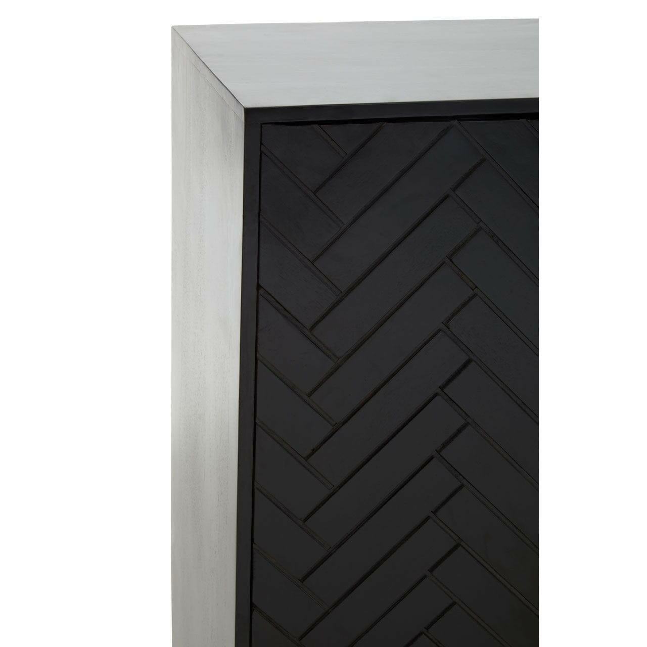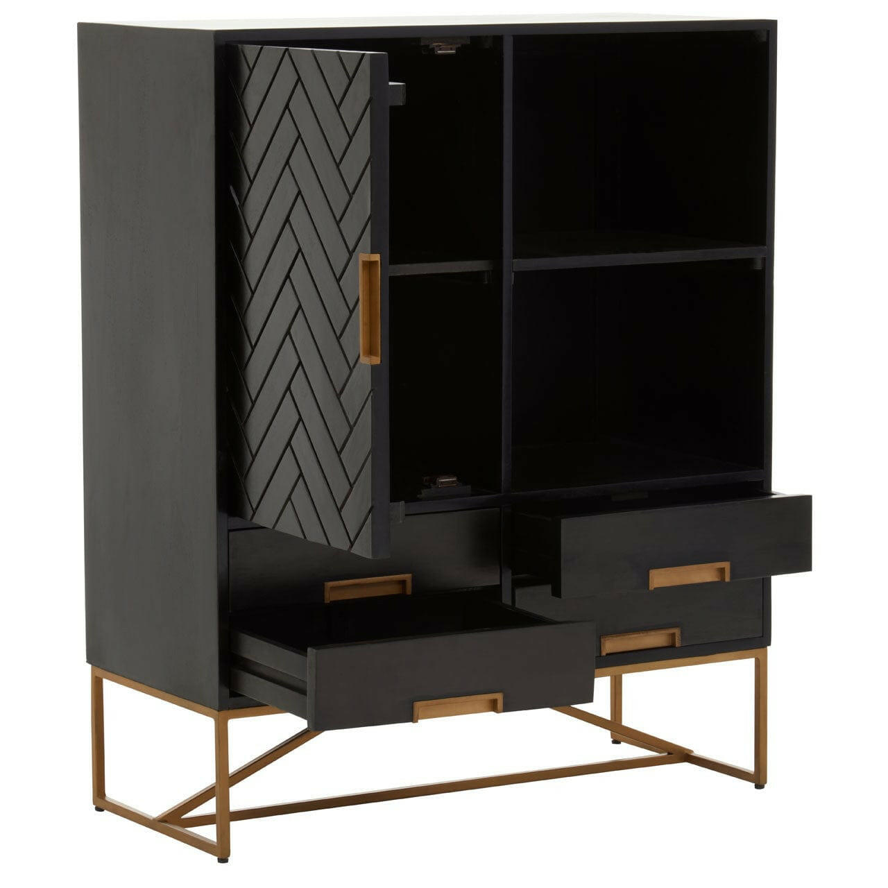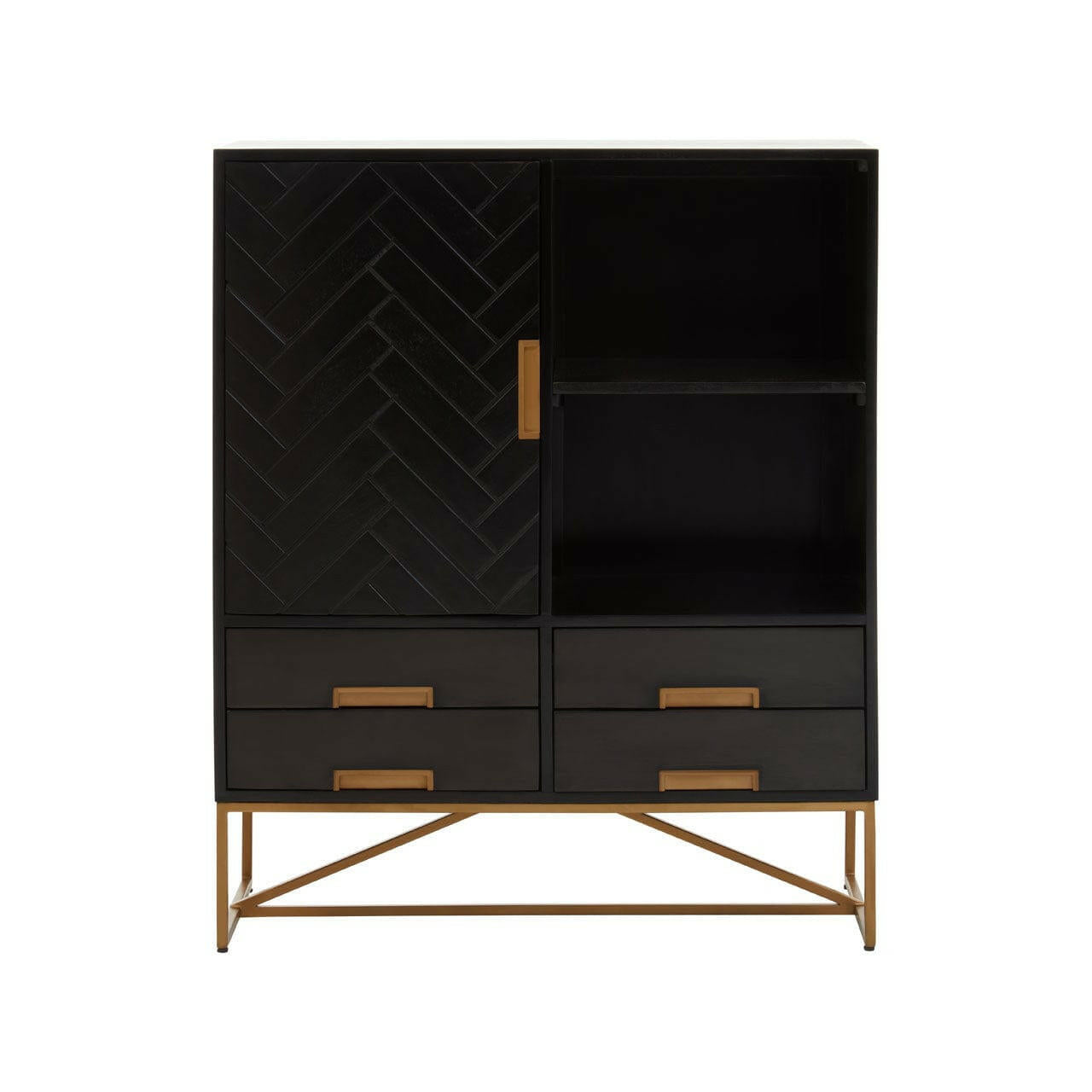 The Kochi cabinet has a bohemian aesthetic. Panels of mango wood form a herringbone pattern across the front of the cabinet, which is complemented by gold iron handles and legs. Ample storage space is available thanks to the shelved storage space and drawers.