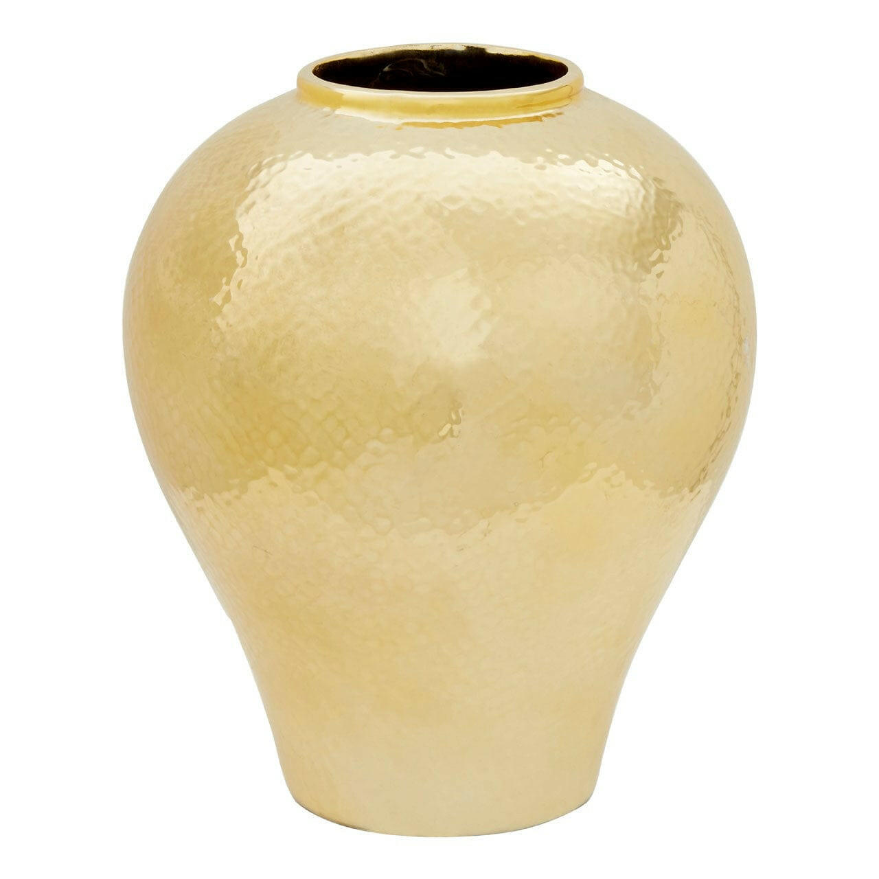 This exquisite vase is made from ceramic and sports a hammered surface that gives it a textured finish. Coloured gold, it features a reflective gold finish for a lustrous look. Inspired by the traditional Meiping approach, it follows the classic plum shape, and features a slightly raised rim opening at the top.