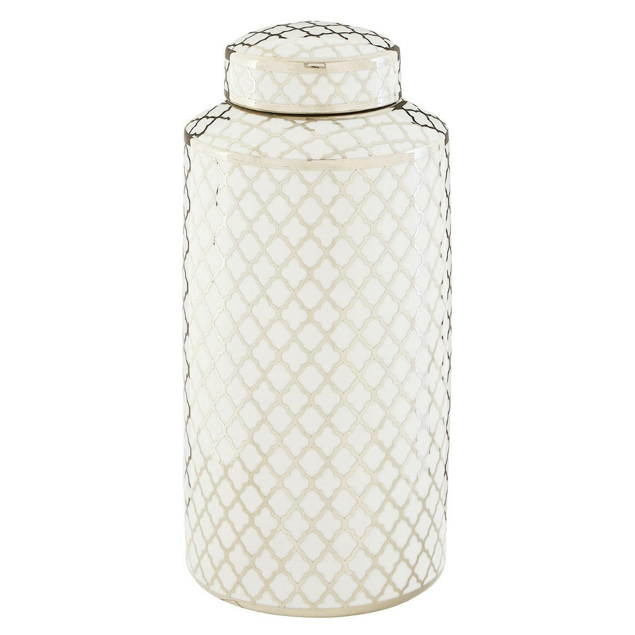 The Renne Large Jar from Hamilton Interiors is a stunning addition to any home. Made from smooth ceramic and glazed for a beautiful sheen, this jar features a crisp white base with a silver quatrefoil pattern inspired by Arabesque design. Its cylindrical shape and narrow shoulders add a touch of elegance, while the round lid completes the look. Measuring H37 x W18 x D18cm, this jar is perfect for displaying on a shelf or table. Coordinate it with silver metallic textiles and lighting for a cohesive and luxurious look. Shop now at House of Isabella for free UK delivery on all orders.