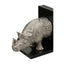 This set of two bookends boasts a unique rhino design - one features the rhino's rear and the other features the head, complete with horn. Finished in a reflective silver tone, the metallic rhino design is highly detailed and textured.