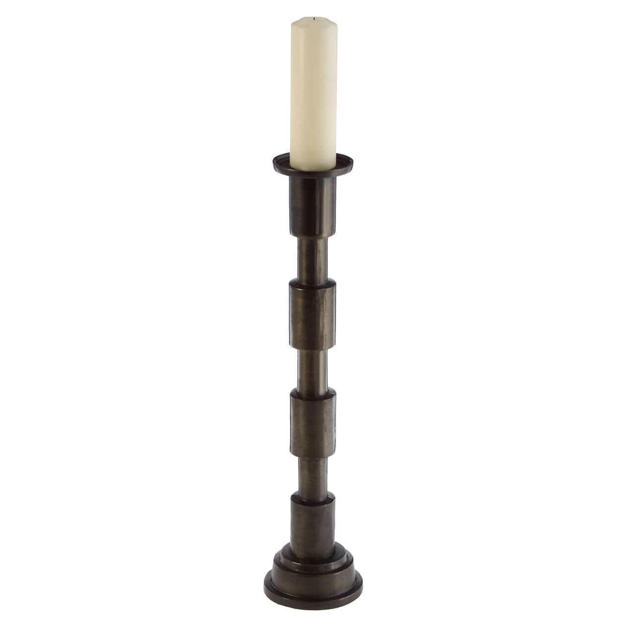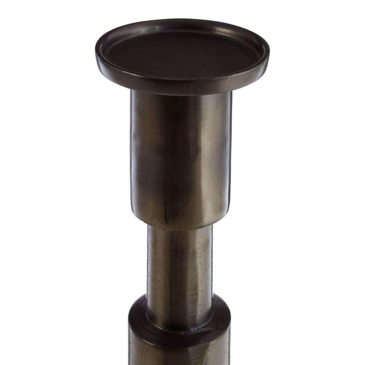 The small Zac floor standing candle holder is designed with simplicity at its core. The metallic candle holder is created in a pillar-style with individual cylindrical modules that taper from one to the other. The textured metal material is finished in a stylish black nickel-tone that is both versatile and modern.
