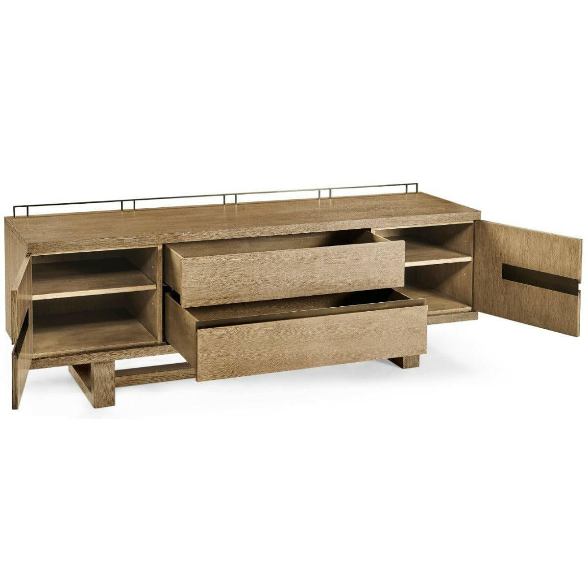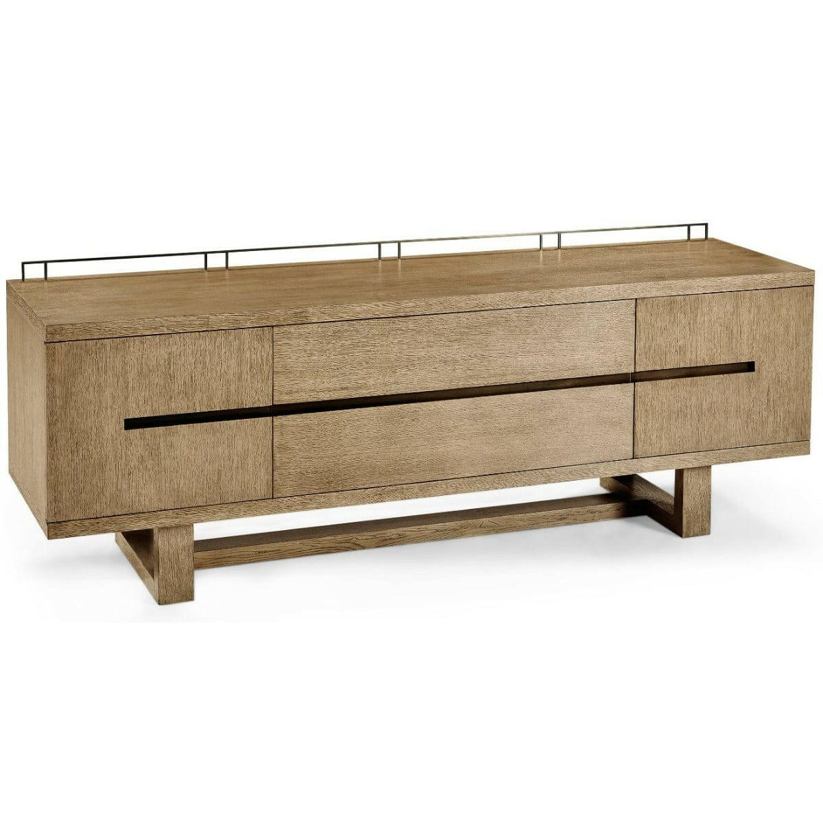 Constructed from American oak with a lightly textured ceruse finish. Gallery and pull inset are brass with a deep, rich patina. Interior features one adjustable shelf in the centre and one adjustable shelf in the right and left compartments. Bottom height: 20.5 cm. Drawer depth: 42.7 cm. Drawer height: 13.3 cm. Drawer width: 85.6 cm. Height shelf to shelf: 16.9 cm.