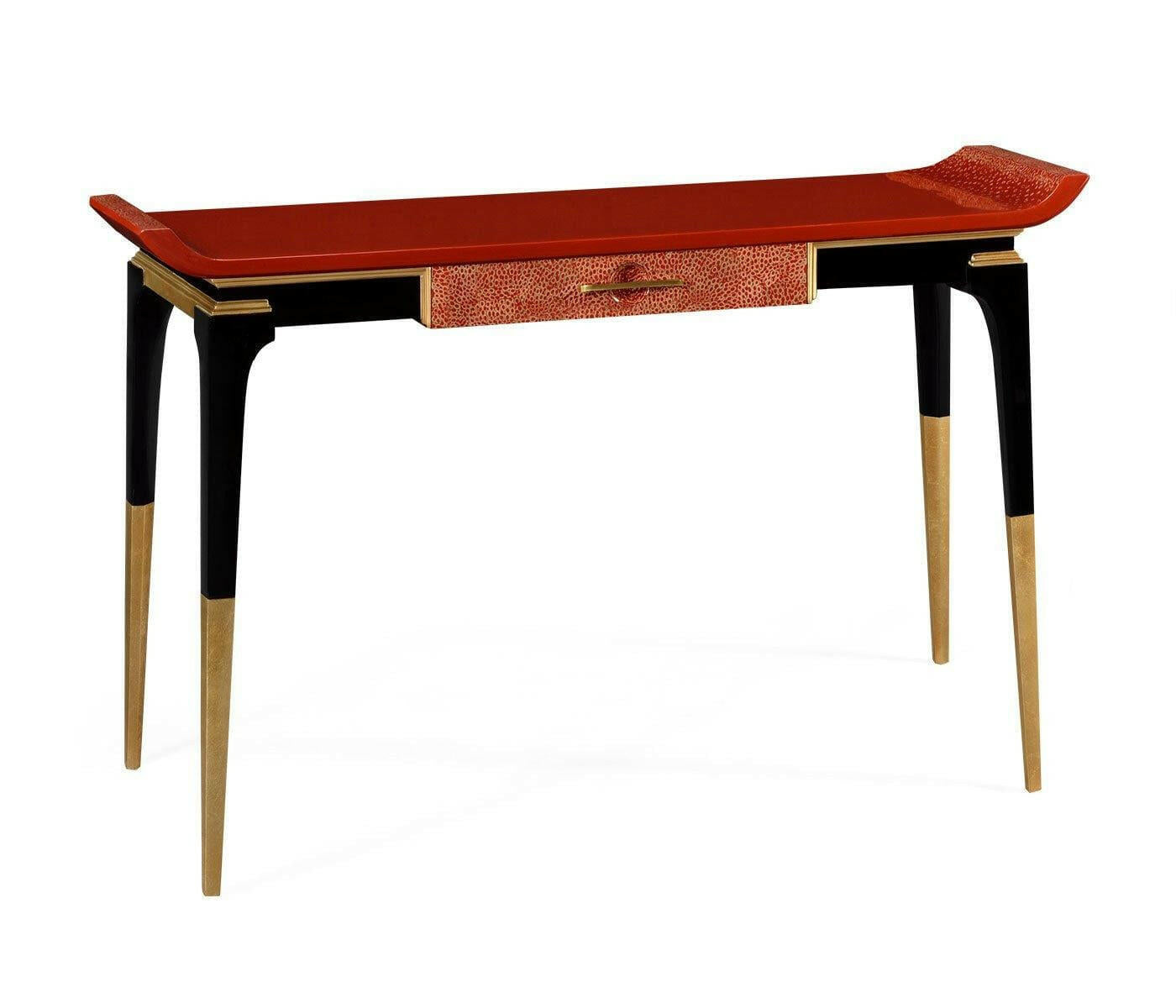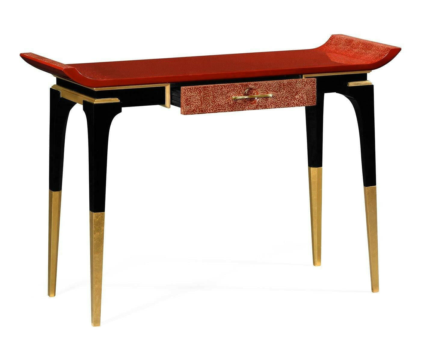 Emperor red console table with an alter table style top and a single drawer inlaid in red eggshell, set above a gold-leaf foil mix with a black gloss lacquer base.