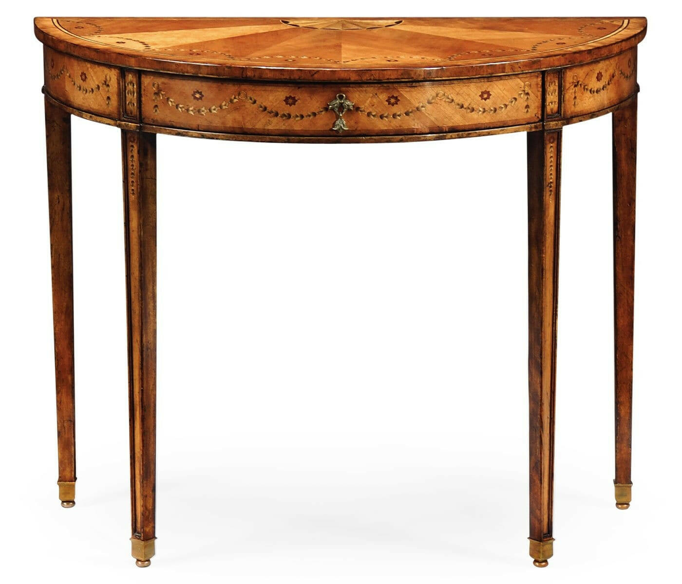 The Sheraton Satinwood Console , part of the Versailles collection by Jonathan Charles , is a handsome reproduction satinwood demilune console table with fine hand cut marquetry inlay on the top and sides, supported by square tapered legs on cast brass feet. This piece exudes quality and would make an eye catching statement in your entrance hall or corridor.