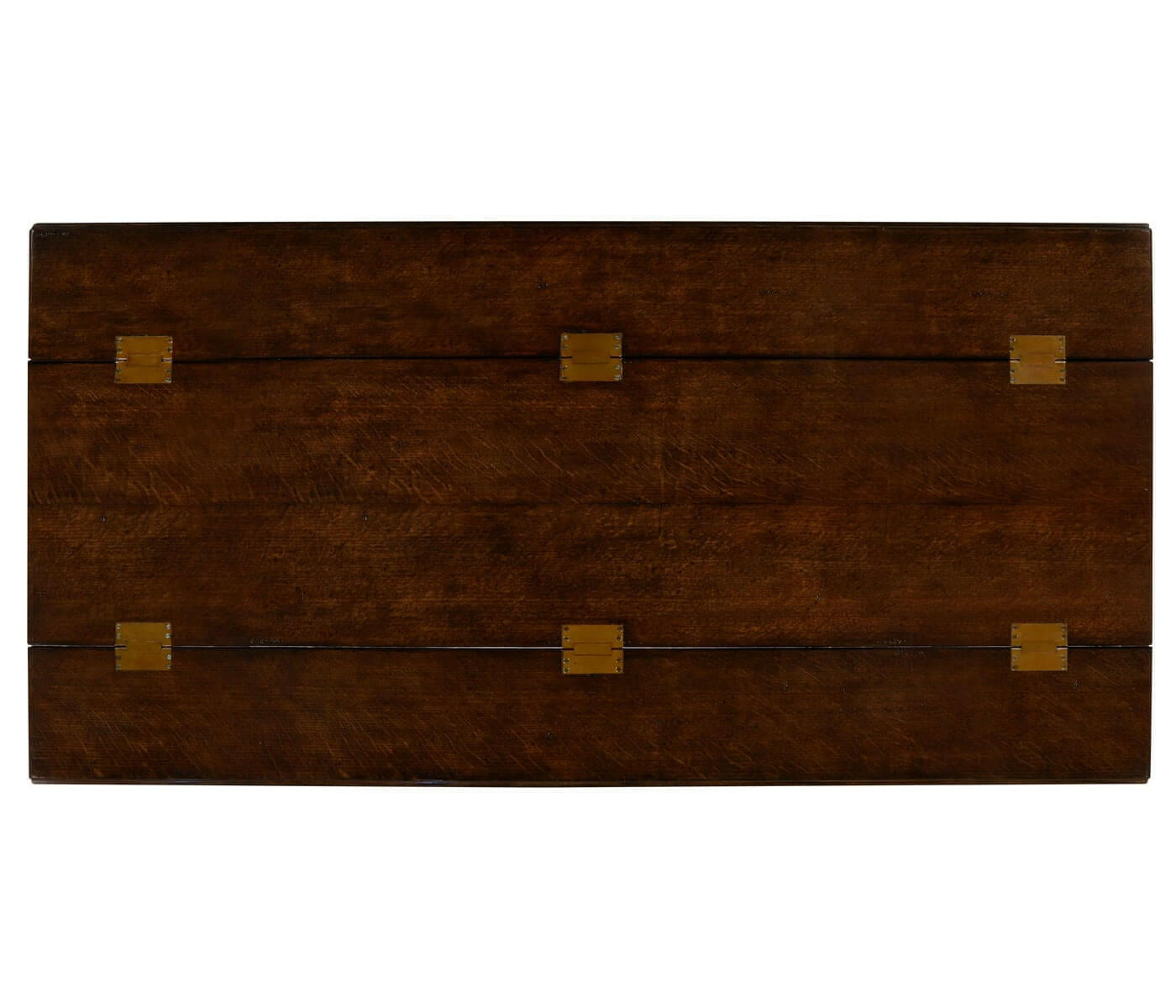 Distressed dark oak hunt table that folds out to reveal antique brass hinges and planked top.