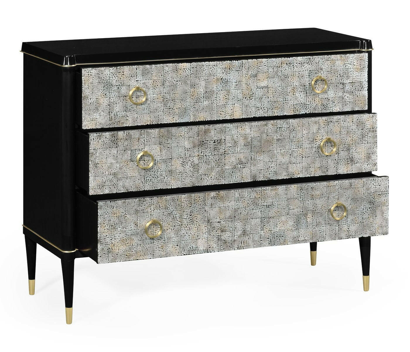 Large chest of drawers painted black with light grey eggshell front drawers, and polished brass handles, detailing, and caps on the feet.