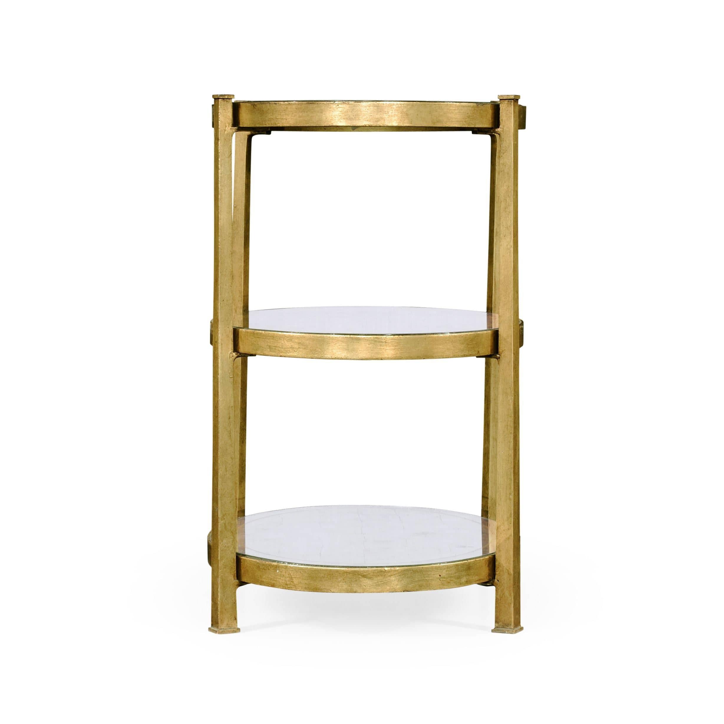 Small Eglomise & Gilded Iron Three-Tier Table Contemporary wrought iron three-tiered oval side table in an antique gilded finish and hand painted eglomise top and shelves. The tapering legs rise above the height of the table top. JC Modern -Luxe Collection Jonathan Charles captures the heyday of the 20s -40s era, translating their underlying influences to the Luxe collection. Strong silhouettes and graphic linearity are mixed with antique beauty for the modern-day interiors. The Luxe Collection is now available in bronze, gold and silver. Jonathan Charles Furniture At Jonathan Charles, it's all in the detail. Renowned for exquisite quality and specialist artistry, Jonathan Charles excel in designing fine furniture and high-quality antique reproductions inspired by the classics of the past. Jonathan Charles Furniture is made entirely by hand using age-old techniques employed by specially trained artisans. it's this craft and attention to detail that breathes character and long-lasting quality into every furniture piece, successfully imitating antique heirlooms from the past.
