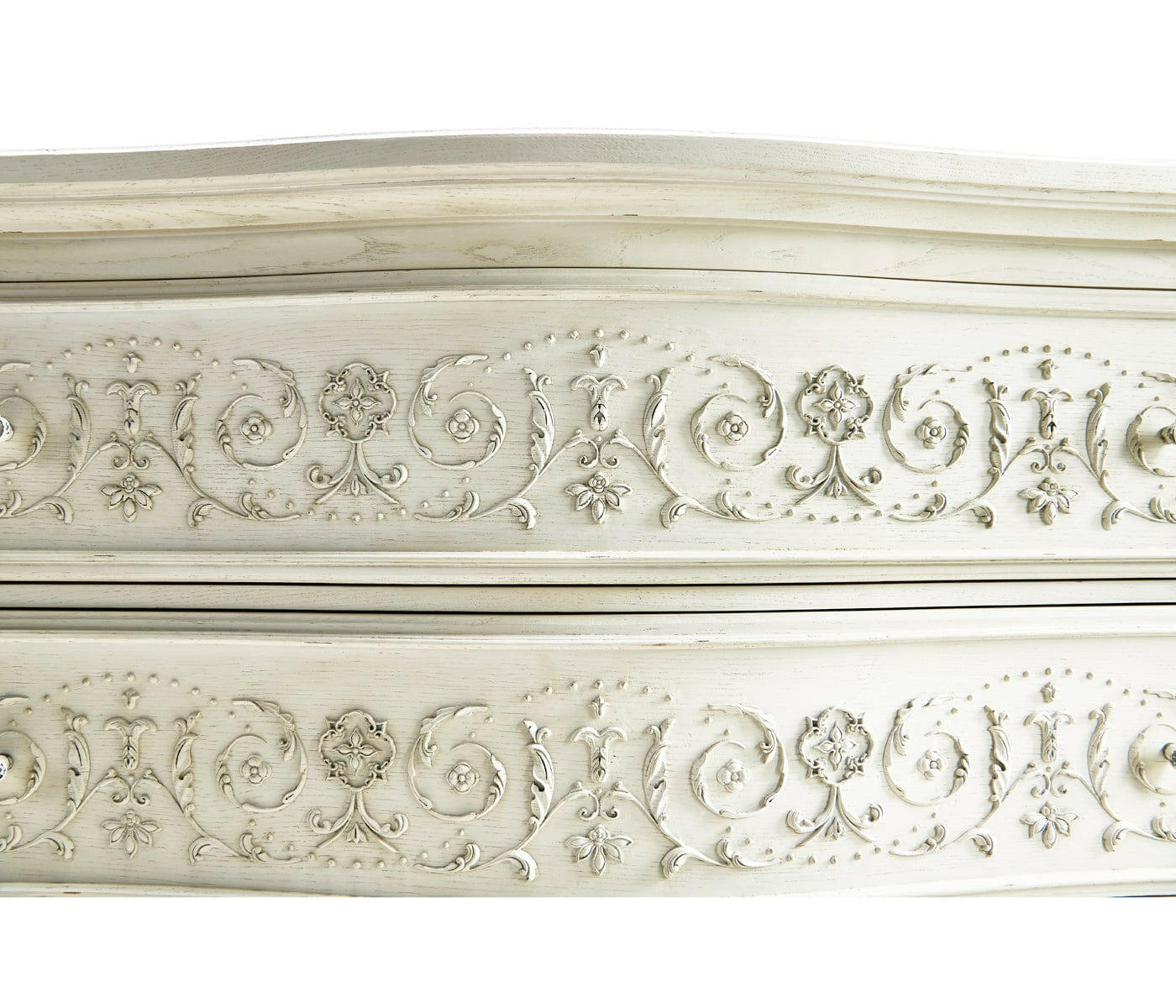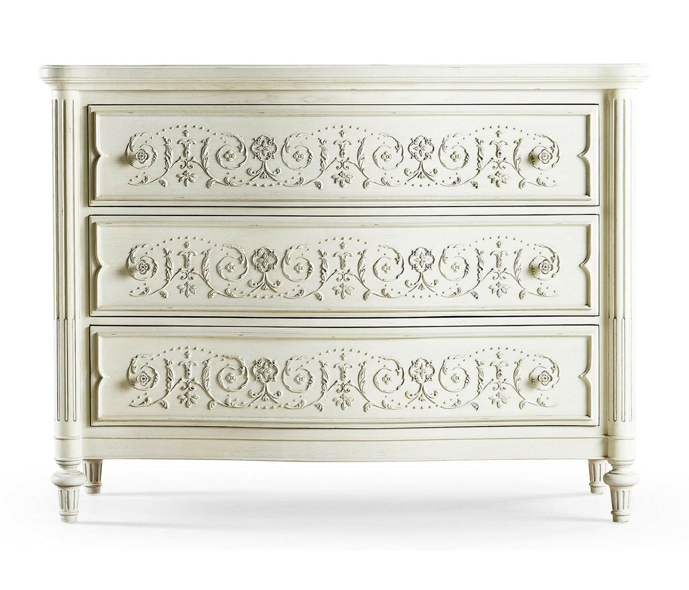 Possessing an alluring depth and a touch of whimsy, the Stratus Chest of Drawers from Jonathan Charles is embellished with an artful hand carved ?oral motif across serpentine drawer fronts between classically lined columns balanced on elongated turnip feet. Featuring custom cast hardware from Jonathan Charles' in-house foundry, this chest of 3 drawers is finished in Chalk White.