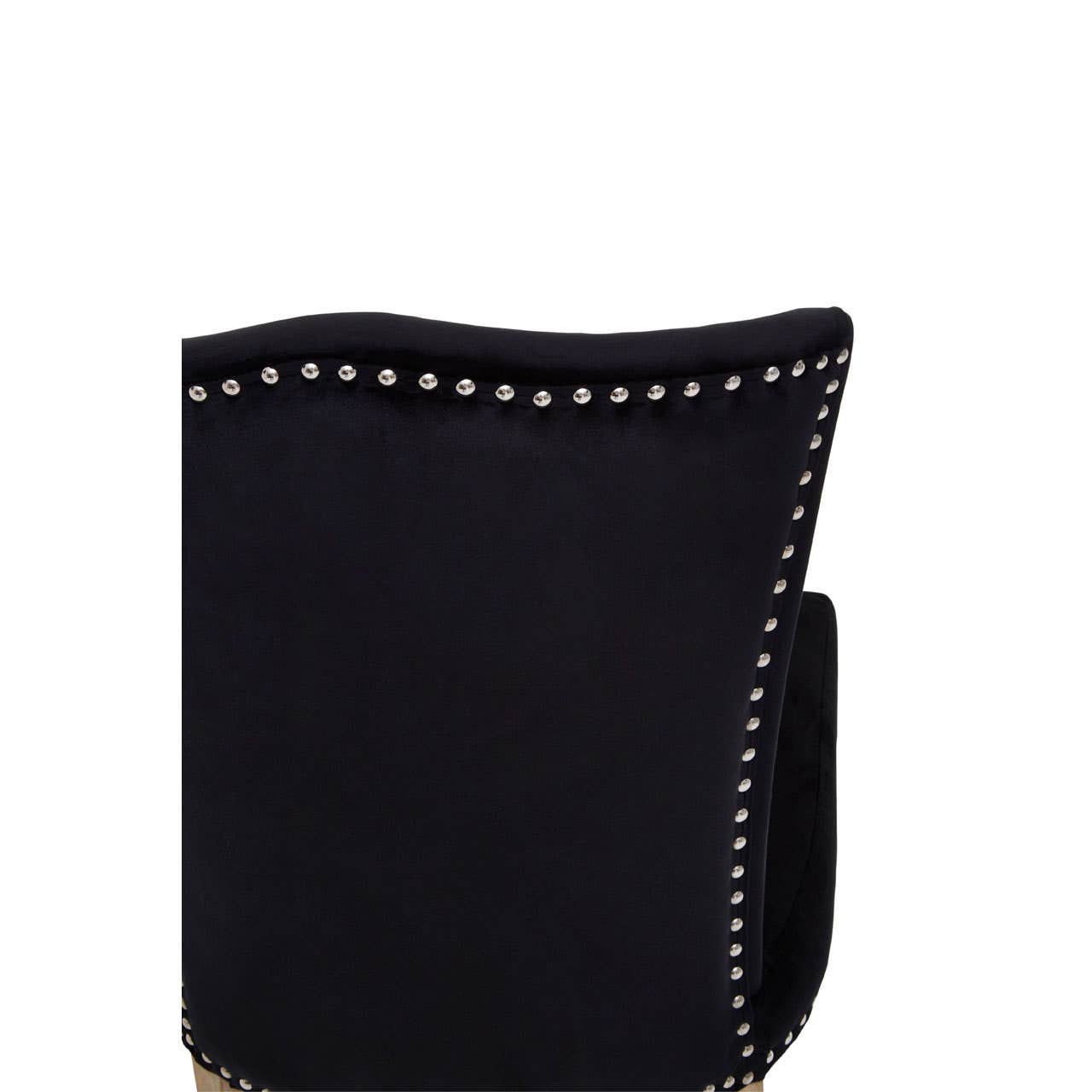 This dining chair is handcrafted and complete with a sumptuous foam padded seat upholstered in black velvet. Fashioned with nailhead trim, this dining chair is supported by tapered wood legs and back, and it blends easily in modern and traditional home decors.