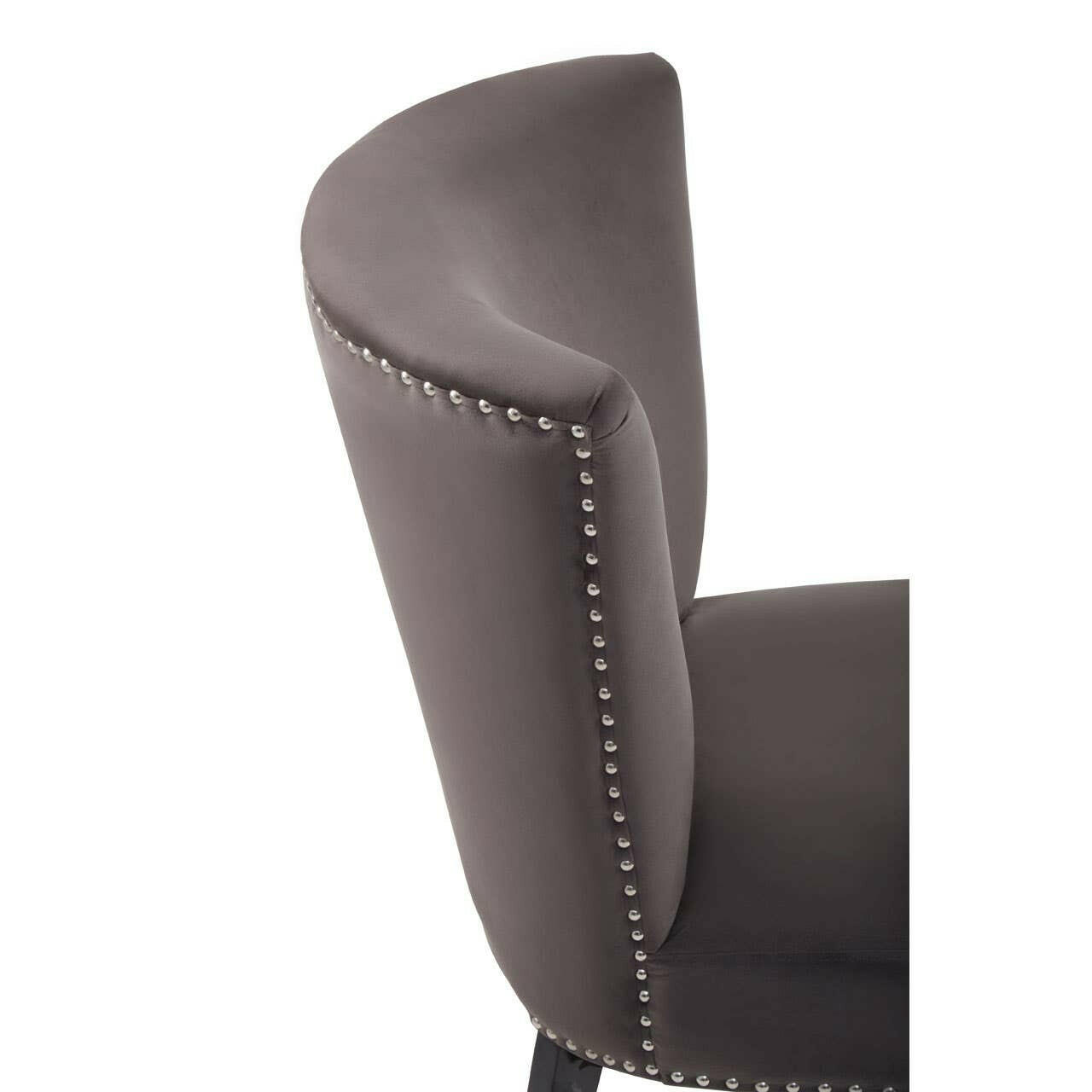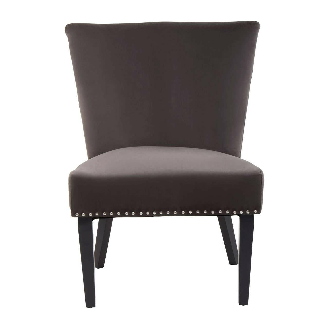 Upholstered in dark mink velvet, this dining chair has generous, deep-cushioned seat complemented by a barrel back. Black finish rubberwood legs contrast the plush velvet while gold finish stud trim enhances the luxe accent.