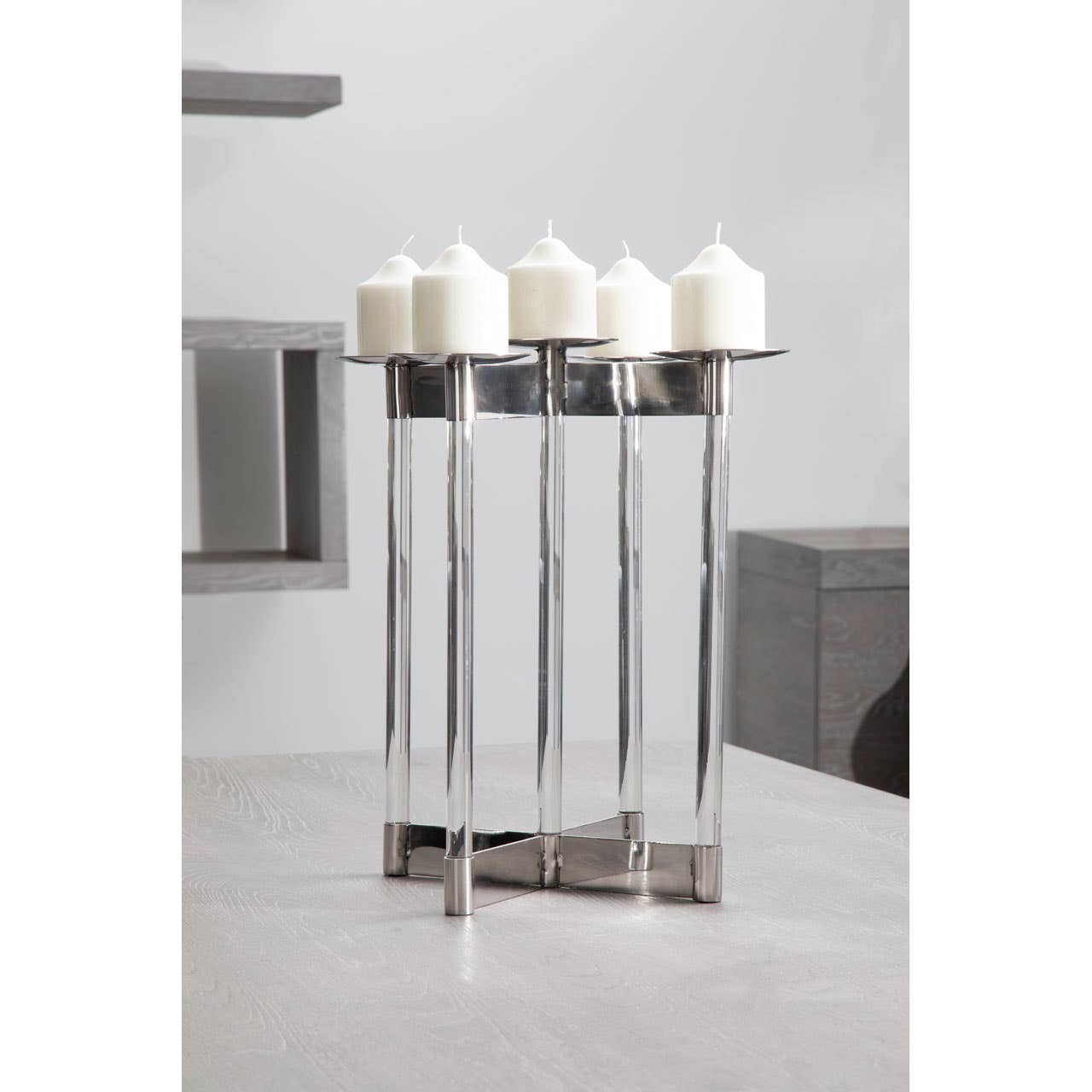 This sleek and reflective candelabra is made from smooth stainless steel and features on-trend acrylic elements. The silver colour produces a reflective finish. It has five round sconces that are perfect for displaying pillar candles.