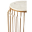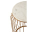 This contemporary table has simple lines which form a symmetrical cage design in a luxe gold finish. A cool white marble top with mild veining neatly sits at the top and coordinates with the open ring bottom. Designed for a contemporary urban space, style this elegant table next to a clean-lined sofa.