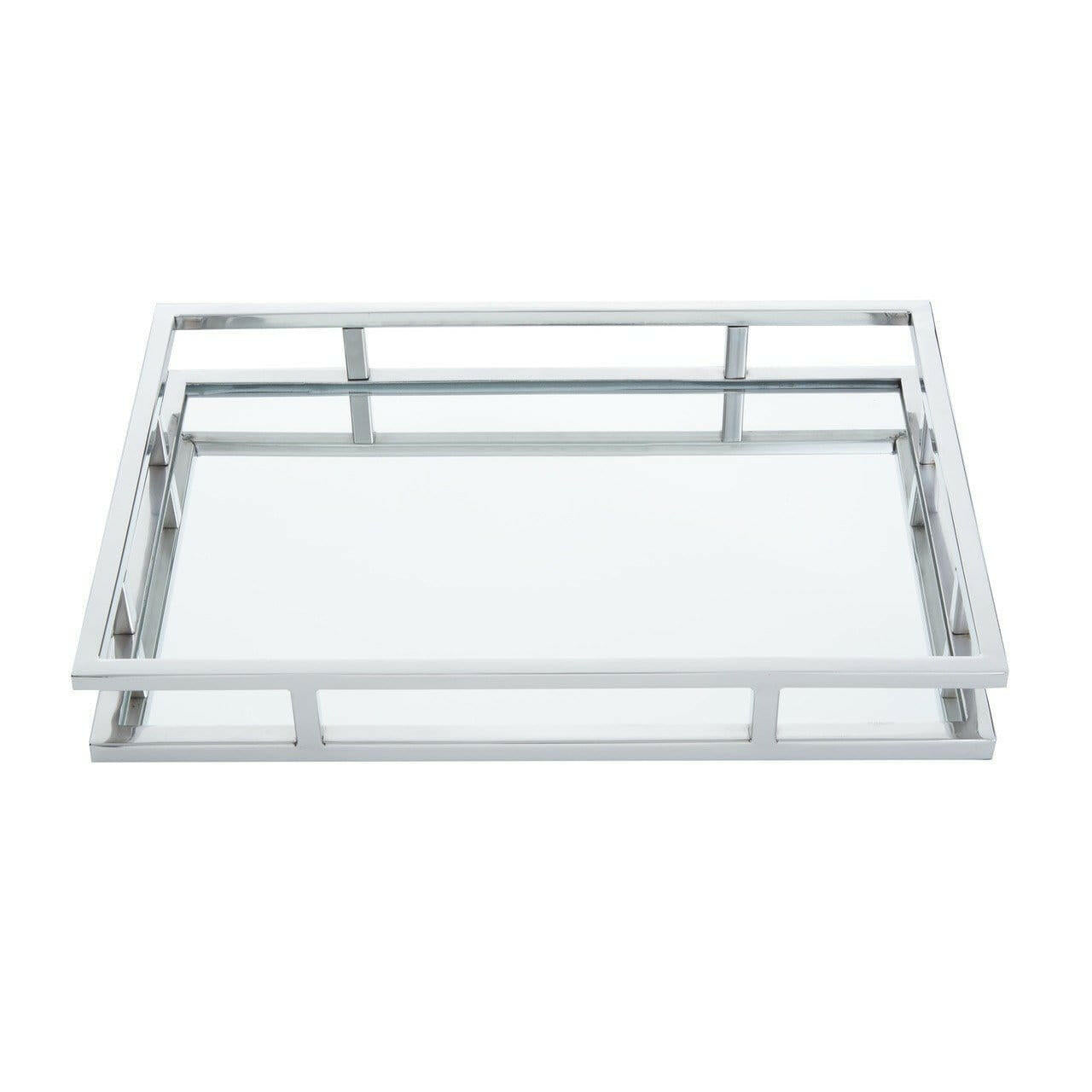 This rectangular tray features clean and straight lines accented in the metallic silver finish with a mirrored bottom. Sleek and modern, use it to hold candles, flowers or on a bar counter to serve cocktail ingredients.