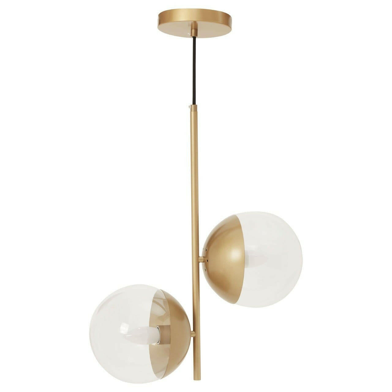 The Revive pendant light showcases a sleek and sturdy profile with two clear glass shades attached to a slim gold finish stem. Stylish and multipurpose, this pendant light is suspended by a cord which is attached to a round canopy.