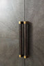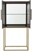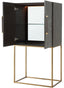 The wooden case and handles of the Travers cabinet are finished in a dark Rowan tone, creating a beautiful complement alongside the leather wrapped doors. A brushed brass finish decorates the open metal base and also accents the two vertical handles. To continue the refined mood, open the cabinet to reveal an atmospheric LED lit interior, with a mirror back and adjustable glass shelf.