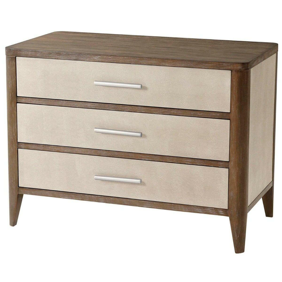 The TA Studio Bedside Chest of Drawers Norwyn in Mangrove is a stylish and compact piece perfect for city apartments, children's bedrooms, or guest bedrooms. Its contemporary rounded edges and subtle mid-century modern design make it a versatile addition to any space. The chest features luxurious Komodo embossed leather drawer fronts in a light Overcast tone, adding an opulent touch to the warm Mangrove finish. The brushed nickel handles add a lustrous appeal to the piece. Crafted with the hallmark artisan quality of Theodore Alexander, TA Studio No. 2 is an elegant realization of contemporary form and function.