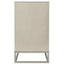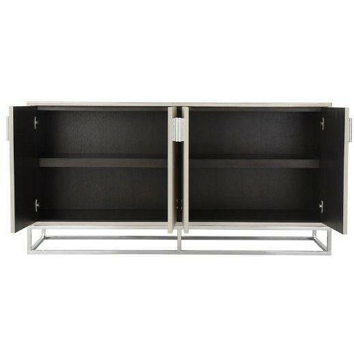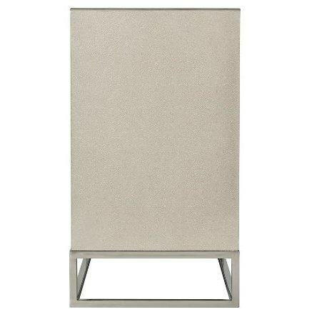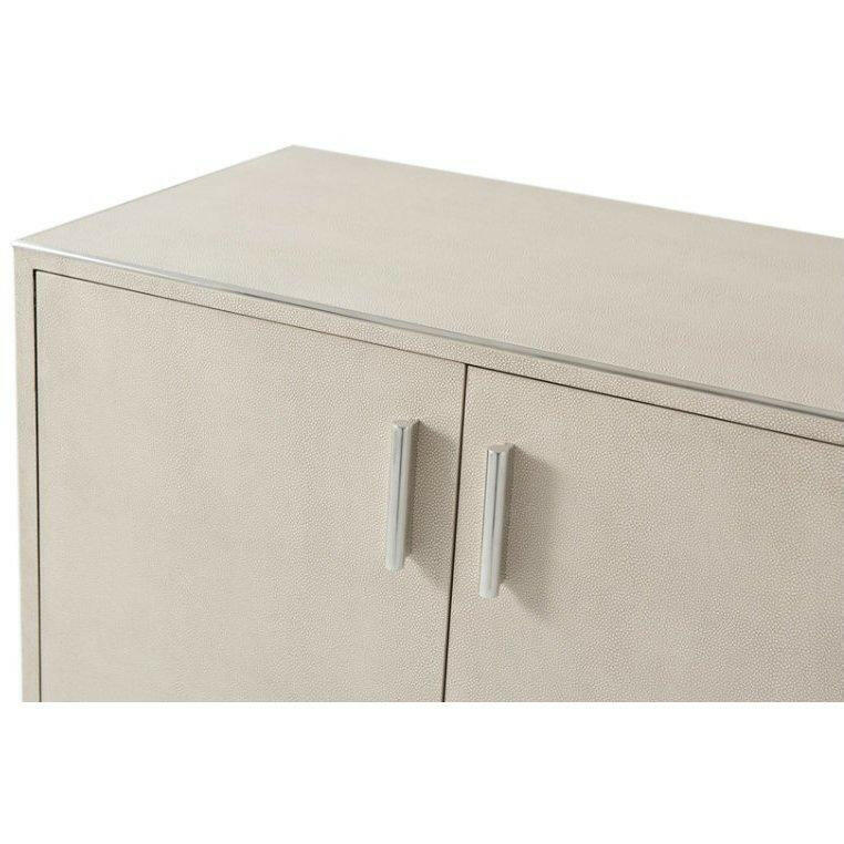 To create a subtle statement, this contemporary sideboard is inlaid with shagreen-embossed leather in a neutral Overcast finish. This light leather is complemented by a base, moulding and handles in a polished nickel finish. The top surface grants extra room for decorative accessories or could provide a functional purpose such as acting as a luxurious television stand.