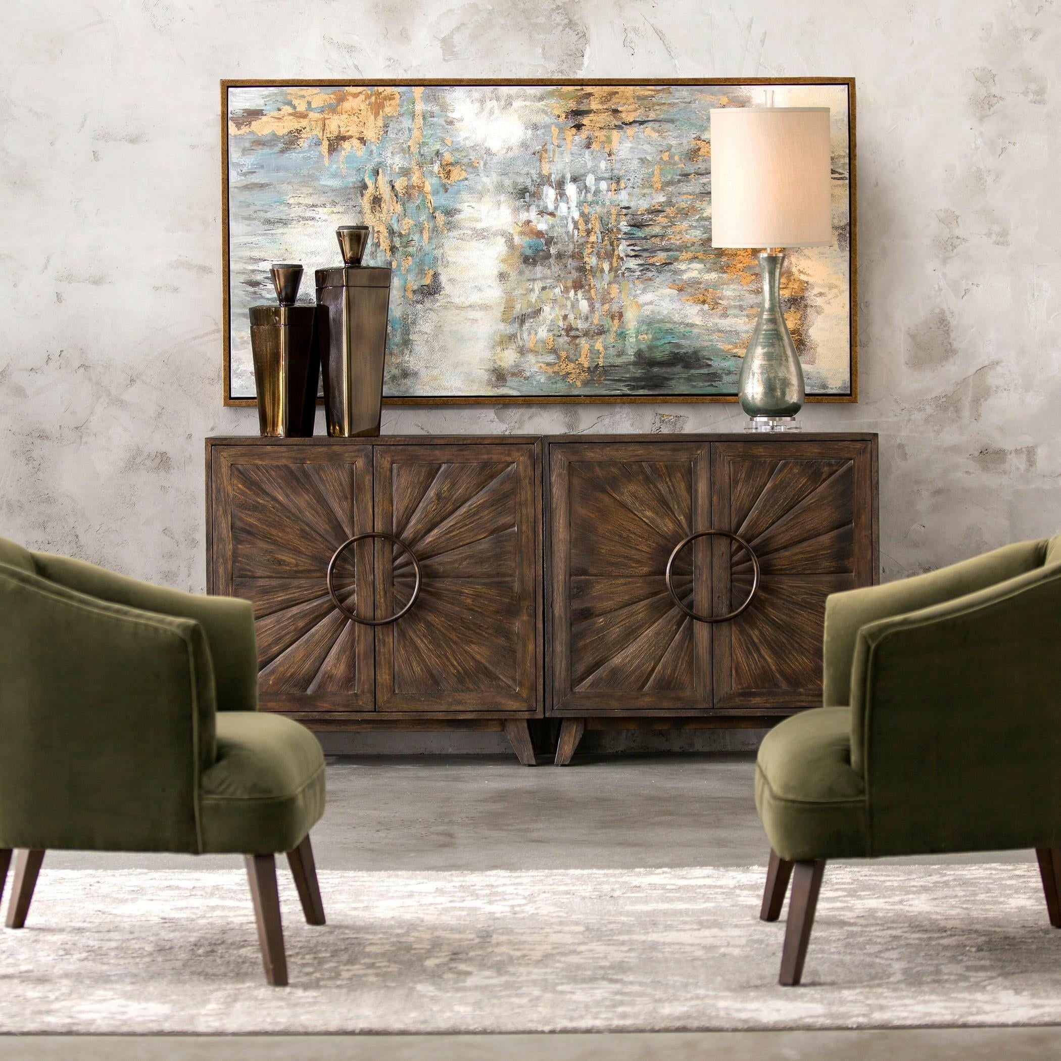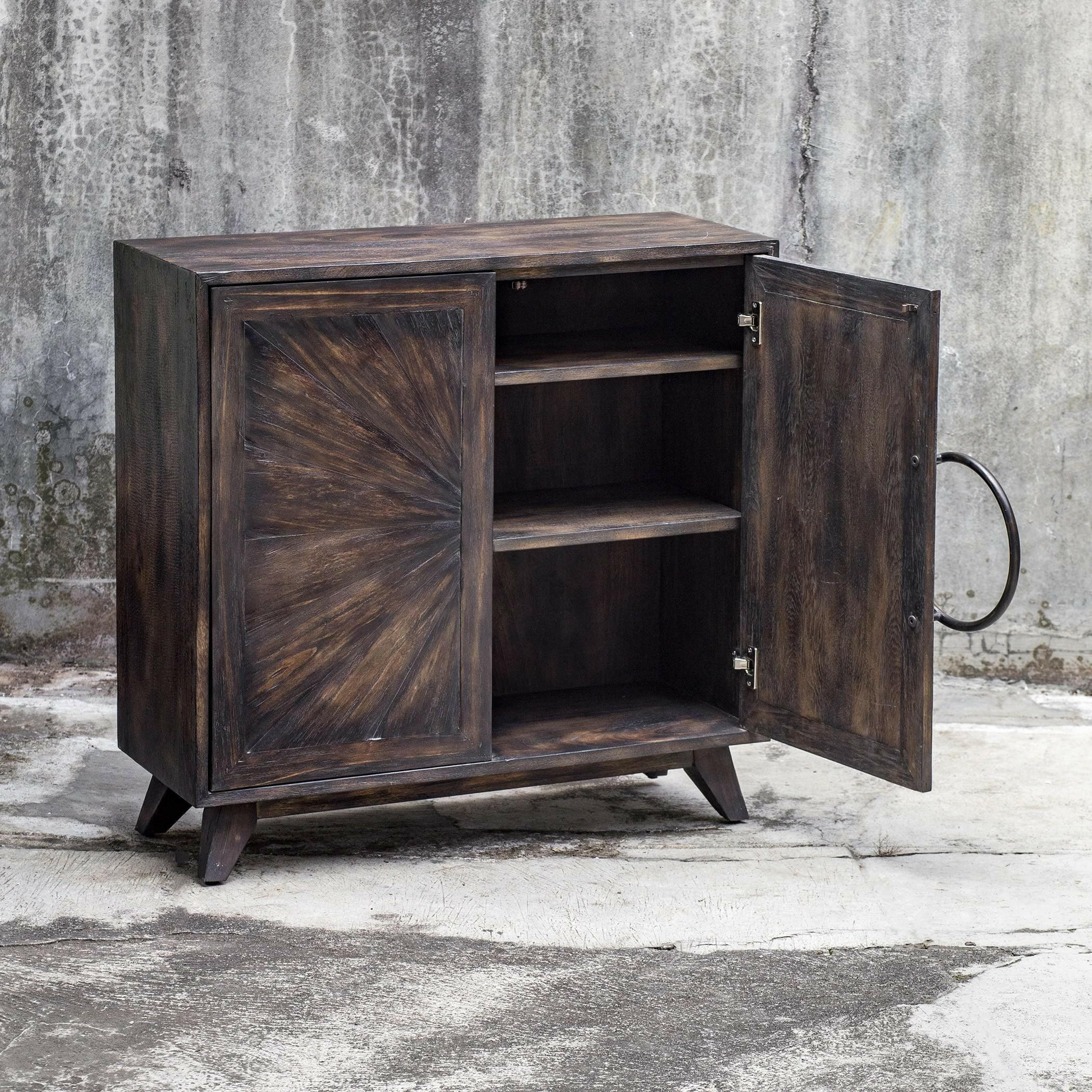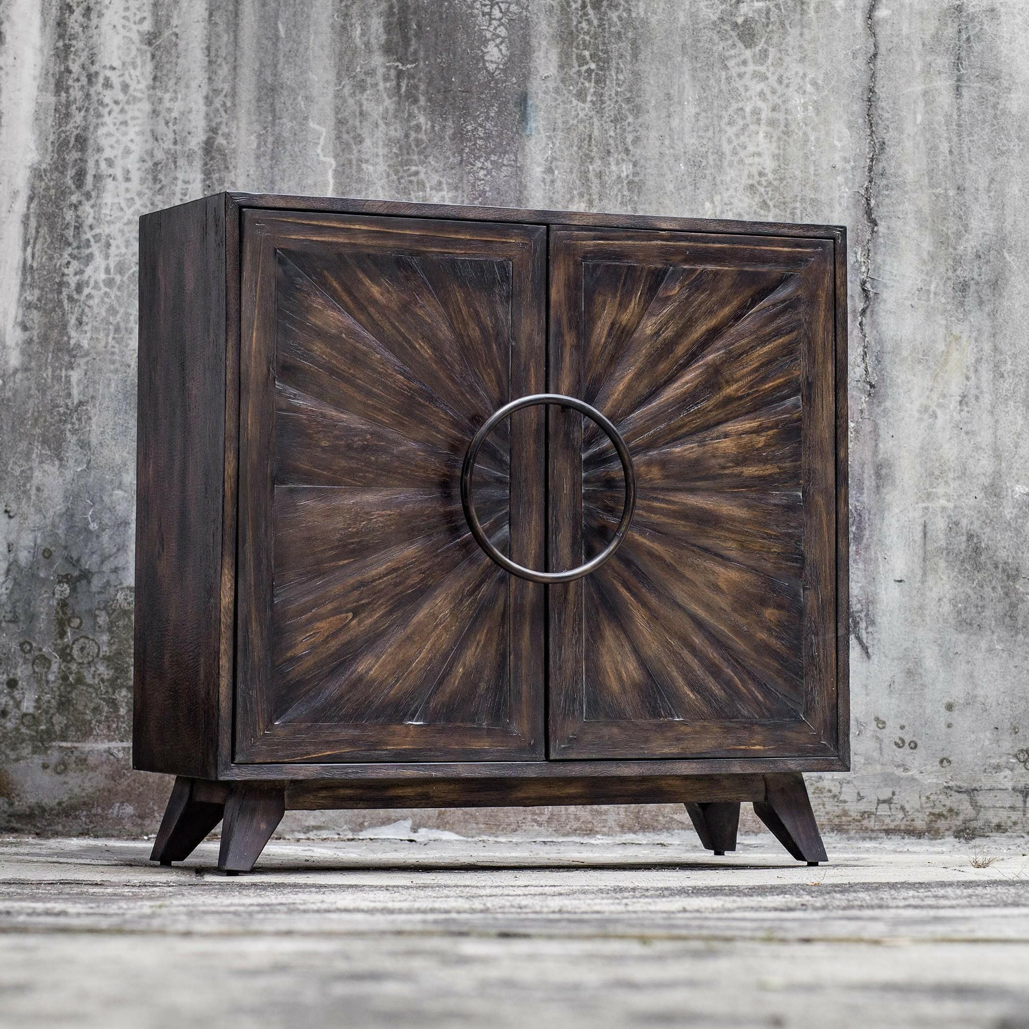 Introducing the Kohana Black Console Cabinet, a truly unique and luxurious piece from Uttermost. This two door cabinet features a hand rubbed finish of worn black with honey undertones and gray glazing over mango veneer, giving it a glowing and elegant appearance. The curved sunburst inlay doors add a touch of sophistication, while the dark bronze iron ring hardware reveals four adjustable shelves inside.