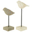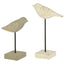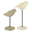 These two bird sculptures are crafted from renewable mango wood in a white and grey wash finish. Sitting on a slender iron stem attached to a square base, each one has warm metallic engraved lines which give them a decorative flourish. This pair will make a striking feature when styled together on a side table or mantel shelf.